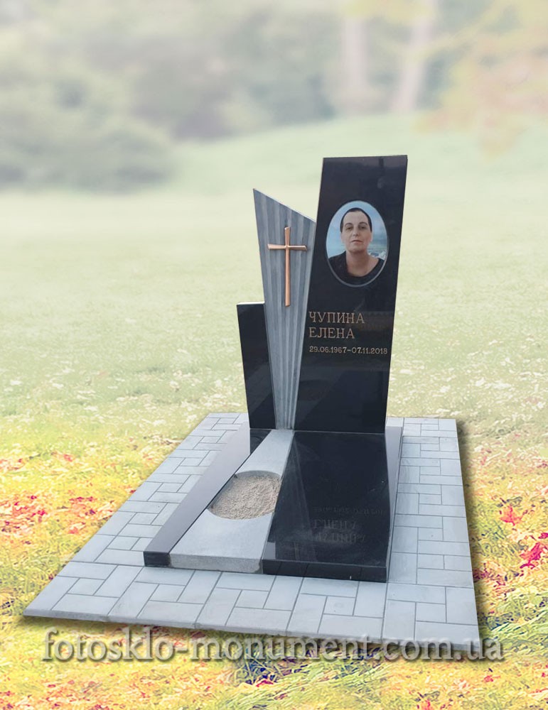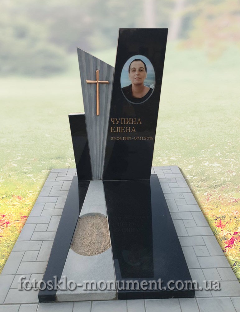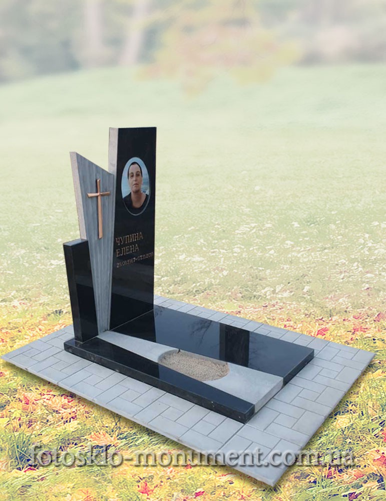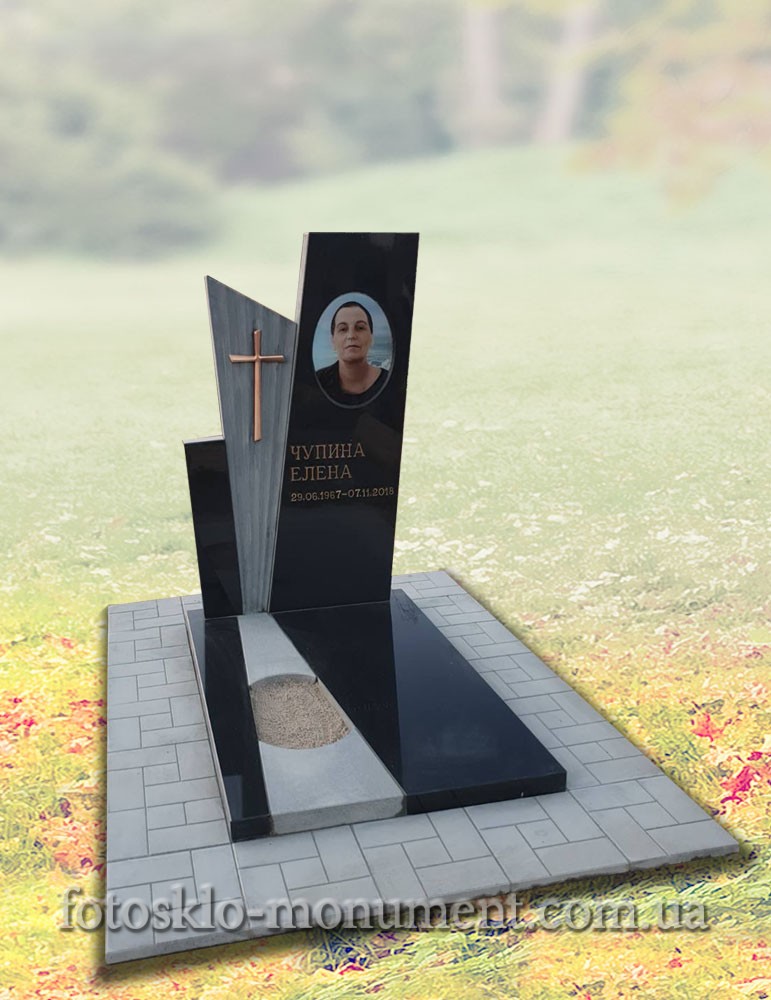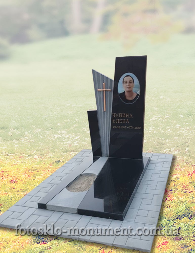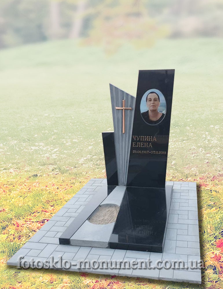Памятник изготовлен из черного и серого гранита. Портрет овальной формы в стекле (под стеклом) по технологии "Фотоскло" Небольшой крест дополняет памятник.