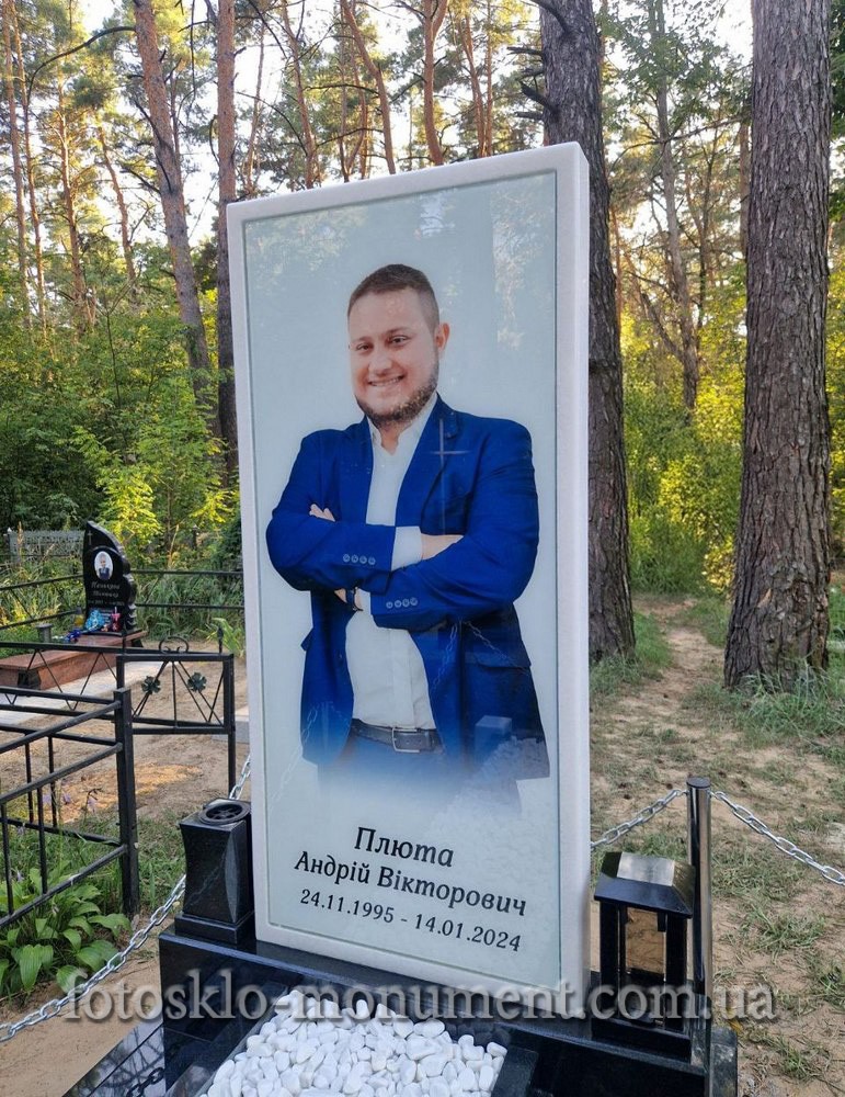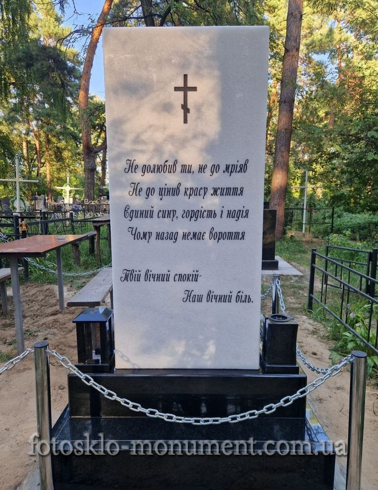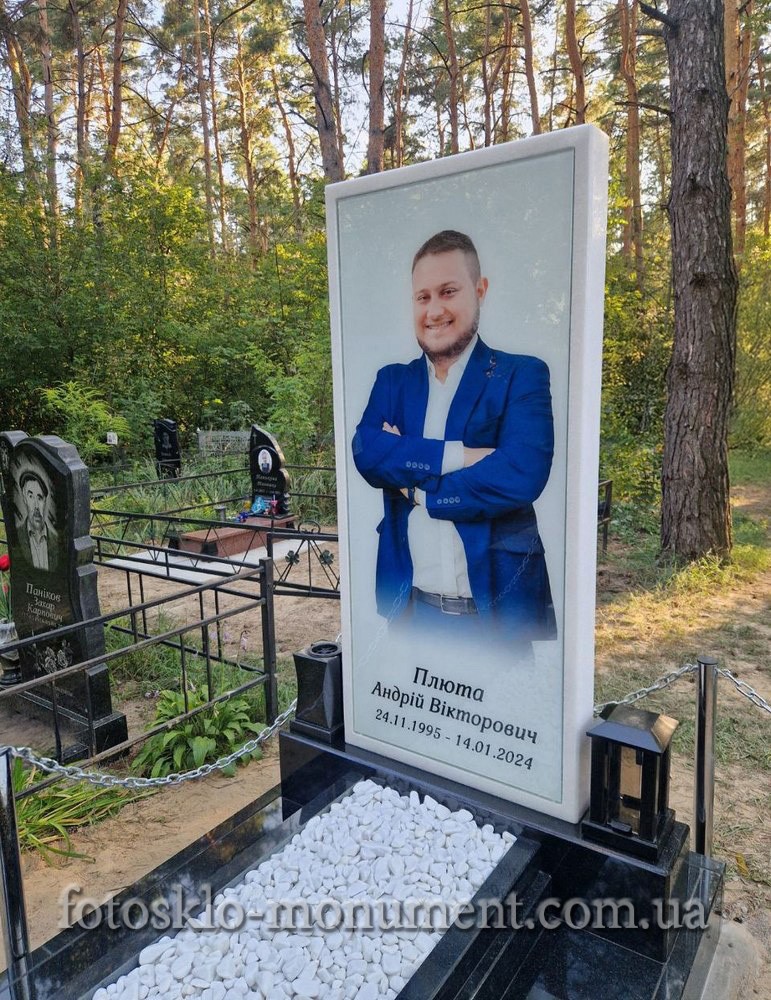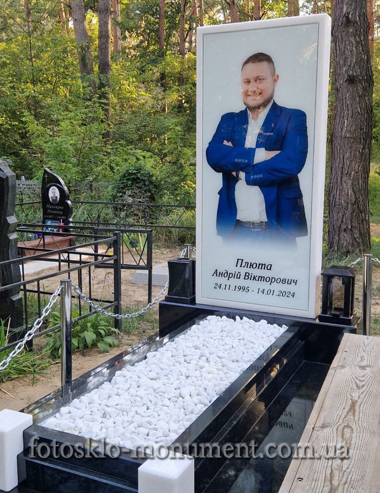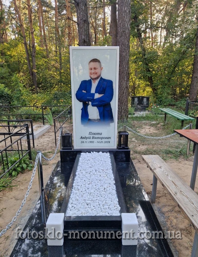 Стелла из белого мрамора, на которой разместили цветную фотографию под стеклом (фотостекло). Фотостекло изготовлено по технологии FotosklO, которая сохраняет реалистичность изображения и выдерживает влияние природных факторов. На оборотной стороне памятника написана епитафия. Основа памятника выполнена из крепкого черного гранита, что обеспечивает долговечность и элегантный вид. Цветник, заполненный белыми камнями, добавляет легкость и символизирует чистоту памяти.