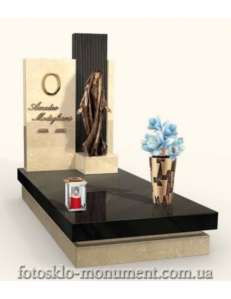 Красота, изысканность, умиротворенность и одухотворенность – именно такие слова приходят на ум при взгляде на этот удивительный памятник. Надгробная плита украшена небольшим пьедесталом, который венчает статуя Пречистой Девы Марии, смиренно склонившей голову. Фигура выполнена из высококачественной бронзы. Также памятник украшен элегантной бронзовой вазой с оригинальным геометрическим узором и лампадой. Изделие выполнено из дорогого итальянского мрамора, но по желанию клиента наша фирма сделает точно такой же памятник из украинского гранита, что позволит снизить его стоимость. Мы предоставляем услуги по установке памятников в Киеве и по всей территории Украины.