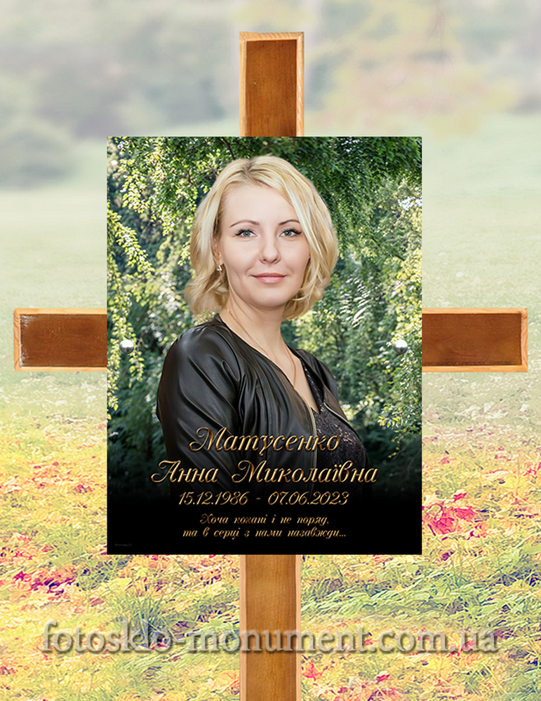 Красива та виразна альтернатива гранітним табличкам на могилу, які традиційно ставлять на цвинтарі. Розмір фото у склі (фотоскло) може бути різним, як кольоровим, так і чорно-білим. Так само можна розмістити епітафію та дати. Важливо вказати кількість кріплень, якщо табличка буде на хресті.