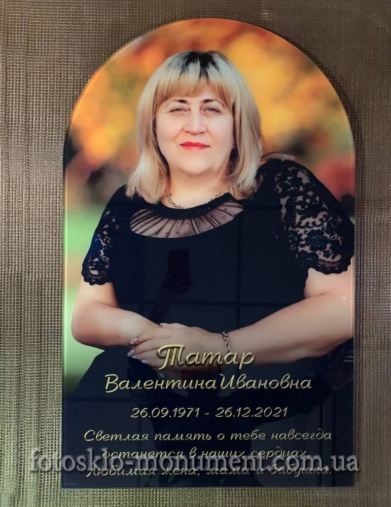 Фото на склі для пам'ятника, різні розміри та форми. Фотографія під склом може бути кольорова або чорнобіла. Наші дизайнери зроблять фоторетуш фоторафіі. Виготовлення по затвердженому вами макету. Фотоскло можна кріпити трьома варіантами. При замовлені пам'тника або вже на існуючий пам'ятник. Кріплення в нішу. Це заглиблення в плиті.