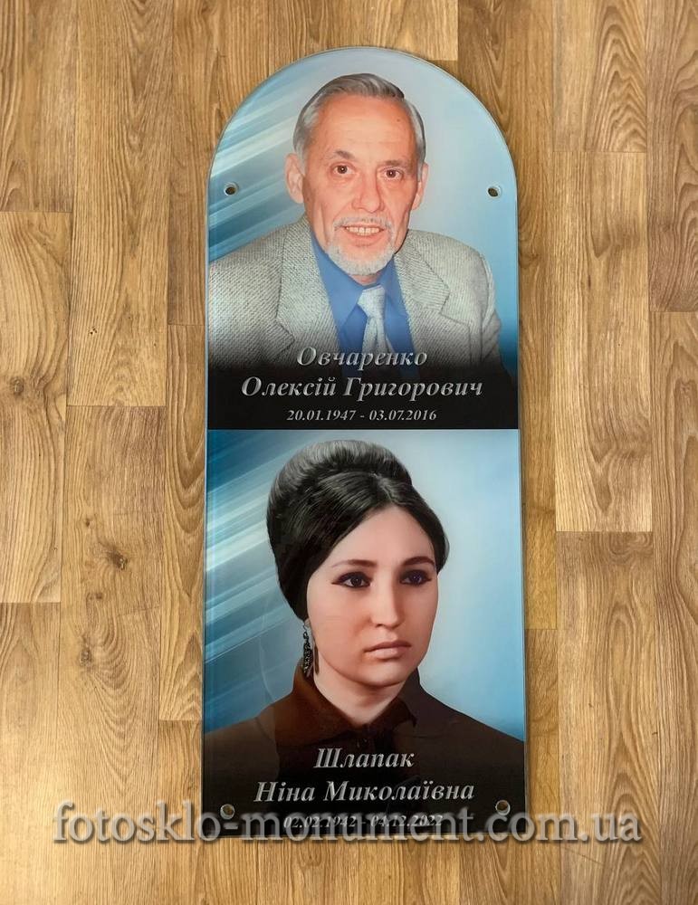 Фото на склі для пам'ятника, різні розміри та форми. Фотографія під склом може бути кольоровою або чорнобілою. Наші дизайнери зроблять фоторетуші фоторафії. Виготовлення за затвердженим вами макетом. Фотоскло можна кріпити трьома варіантами. При замовленні пам'ятника або вже на існуючій пам'ятці. Замовляйте лише оригінал. Гарантія 25 років. Доставка по всій Україні.