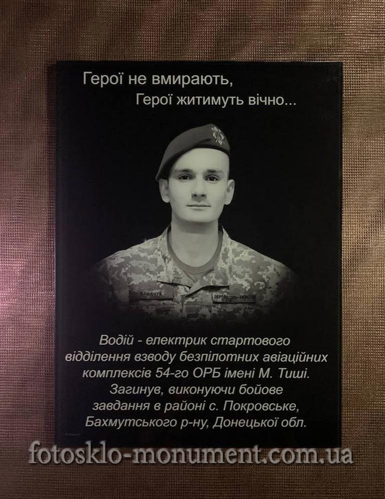 Фото на склі для пам'ятника, різні розміри та форми. Фотографія під склом може бути кольоровою або чорнобілою. Наші дизайнери зроблять фоторетуші фоторафії. Виготовлення за затвердженим вами макетом. Фотоскло можна кріпити трьома варіантами. При замовленні пам'ятника або вже на існуючій пам'ятці. Замовляйте лише оригінал. Гарантія 25 років. Доставка по всій Україні.
