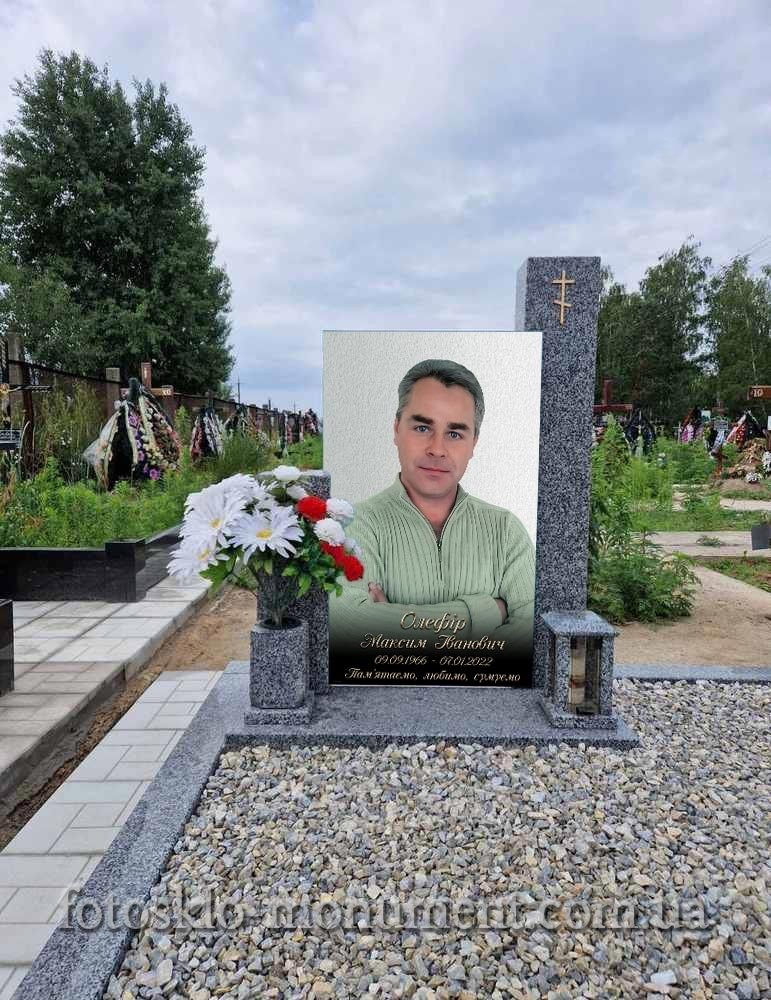 Пам'ятник із сірого та чорного граніту з кольоровою фотографією.Фото зроблено у виробника Fotosklo –..