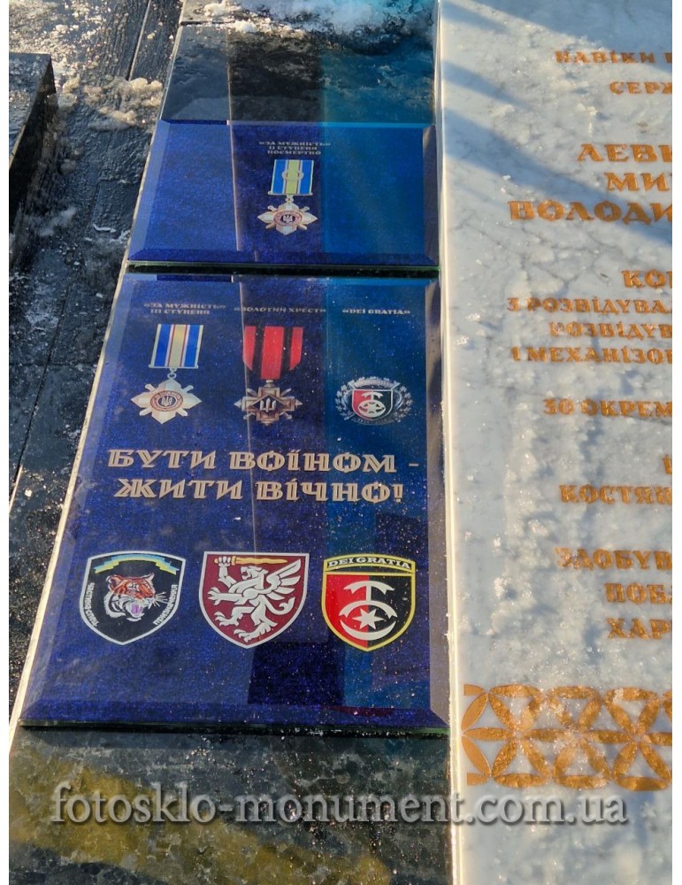 Окремою деталлю пам’ятника є два невеликі фотоскла із зображенням нагород військового, які нагадують про його доблесть, відданість і внесок у захист Батьківщини.