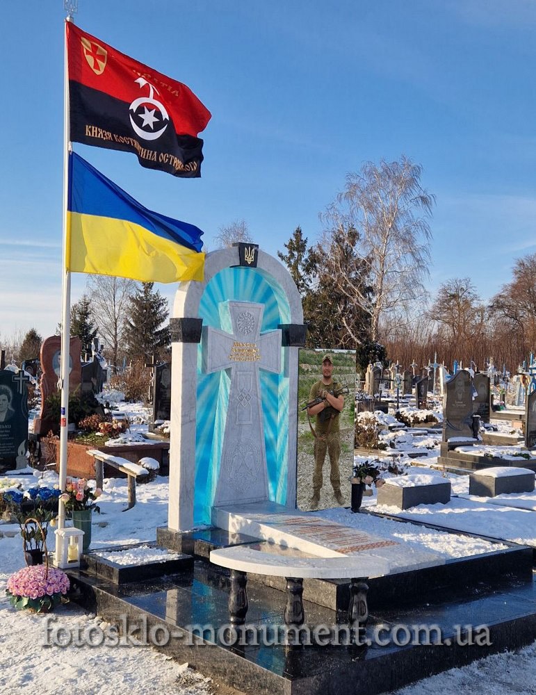 Хрест встановлений у витонченій білій арці з мармуру, яка підкреслює велич і непохитність духу загиблого. Поруч, у повний зріст, розташоване велике фотоскло із зображенням воїна, що створює відчуття його присутності та нагадує про його героїчний шлях.