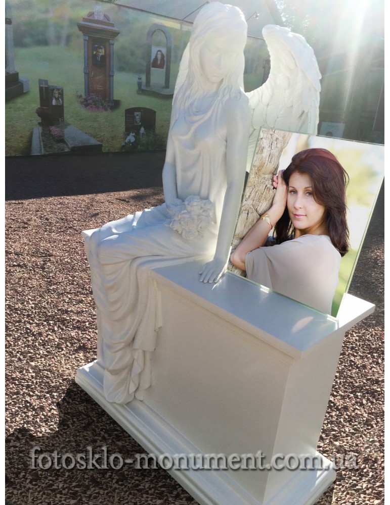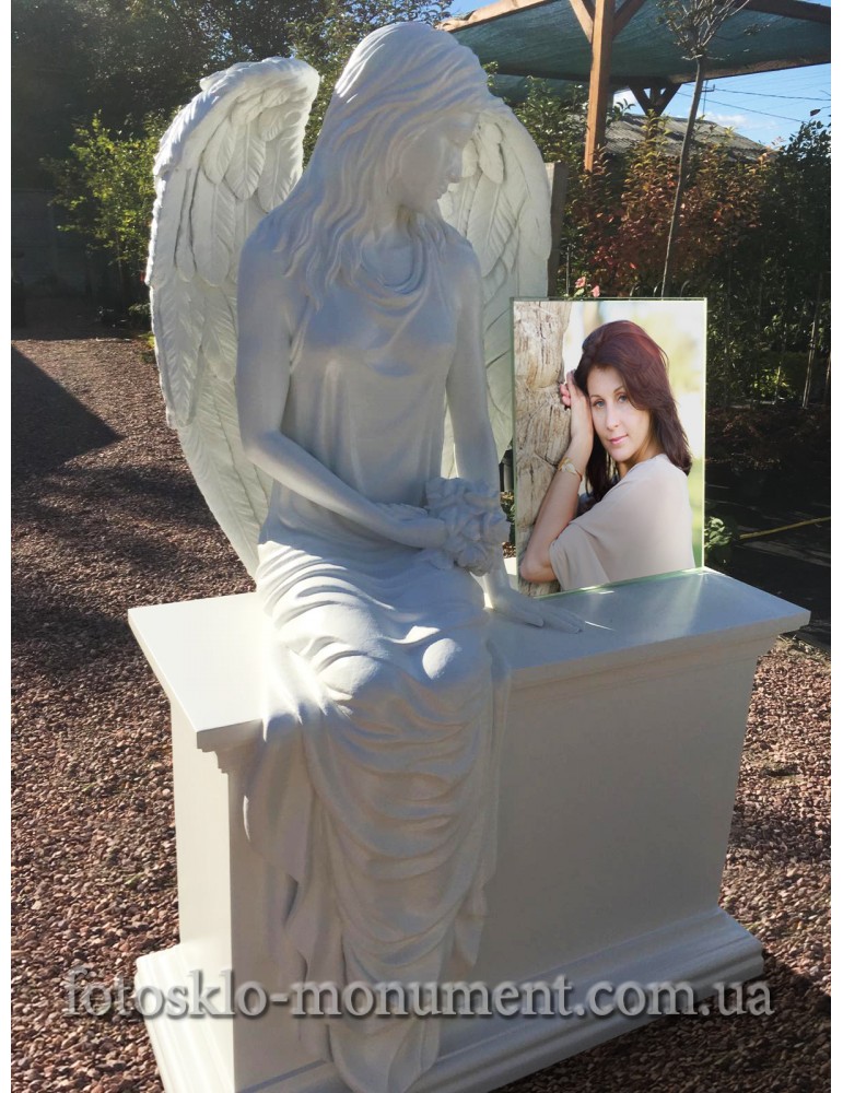Незрівнянний пам'ятник із білого ливарного каменю так схожого на білий мармур. В оригіналі ніжний ангел дивиться на порожнє місце на тумбі, як би на людину якої не стало… Але ми розмістили портрет зі скла на скляній підставці, однак можна змонтувати портрет і написи внизу на тумбі.