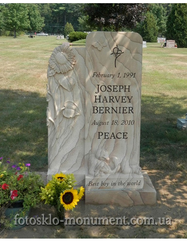 Гранитный надгробный памятник, пронизанный светом солнечного цветка. Казалось бы – возможно ли из натурального камня создать легкий, светящийся обелиск? Не смотря на фундаментальную и надежную конструкцию, это ритуальное надгробие дышит летним ветром и прозрачным умиротворением. Художественное оформление могилы трогает сердце гармоничным дизайном, включающим подсолнух, бабочку, силуэт мальчика со щенком – то, что даст силы родным улыбнуться, ощутить тепло, не смотря на горе и печаль. Обелиск воплощает идею и веру в вечную жизнь в лучшем, светлом мире для чистой души, преждевременно покинувшей нашу землю.