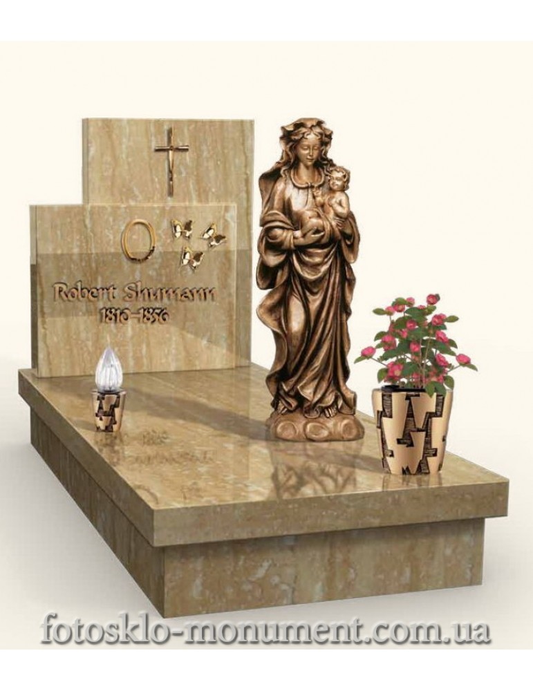 Надгробные памятники, производимые в Италии, всегда отличались использованием самых современных материалов, высоким качеством исполнения и оригинальными дизайнерскими задумками. Этот памятник выполнен из кремового мрамора и благородной бронзы. Он украшен статуей Пресвятой Богоматери с младенцем, которые позаботятся о душе умершего и будут охранять его вечный сон. Легкокрылые бабочки, изображенные на лицевой стороне памятника, символизируют чистую душу и божественное воскресение. Эти образы изящно дополнены красивой лампадкой и элегантной вазой для живых цветов. Такой памятник станет достойным последним пристанищем для доброго и отзывчивого человека, также если нужен памятник для женщины - это подходящий вариант.