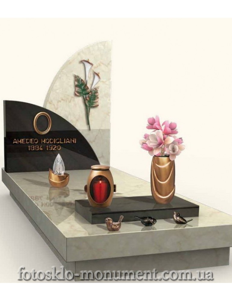 Этот роскошный итальянский памятник изготовлен из белого и черного мрамора опытными мастерами. Надгробную плиту украшают изящные бронзовые вазы и лампада. На краешке надгробия мирно расположились небольшие птички, символизирующие бессмертную душу покойного, которая, без сомнения, попадет в лучший мир. Лицевая сторона памятника украшена двумя белоснежными каллами. Эти прекрасные цветы являются символом добродетели и чистоты. Такой уникальный памятник станет идеальным прощальным подарком для близкого человека, преждевременно покинувшего этот мир, но оставившего о себе светлую и добрую память в сердцах людей. Если нужно найти памятник для женщины или памятник для мамы - это идеальный вариант. По желанию заказчика в эскиз будут внесены любые изменения и дополнения.