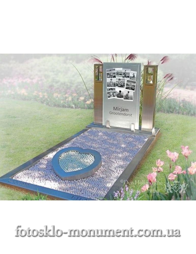 Класичні форми у вигляді серця в квітнику чудово гармонують із наземним обрамленням з мармуру та трьома вертикальними стелами. Центральна стела виготовлена зі скла, на якому розміщено фотоколаж — це можливість відтворити важливі миті життя або передати різні настрої й грані особистості того, хто тут спочиває.