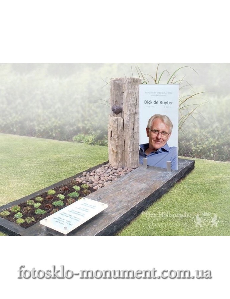 Дуже стильний пам'ятник зі скла в обрамленні натурального каменю красиво та гідно впишеться у будь-який ландшафт місця поховання. З фотоскла виконано не лише великий центральний портрет, а й табличка з епітафією, що розташована на наземній плиті. Хочеться звернути увагу на цікаву ідею квітника – живі квіти перетворюються на каміння – квіти вічності, з плавним переходом у стилізовану під дерево стелу з необробленого граніту. Кам'яне серце в композиції символізує скам'янілі від горя серця людей, які зазнали втрат. Але світлий портрет на пам'ятнику стирає трагічне враження, дає відчуття світла, спокою в цьому особливому куточку, пробуджує думки про світ небесний та душевні спогади.