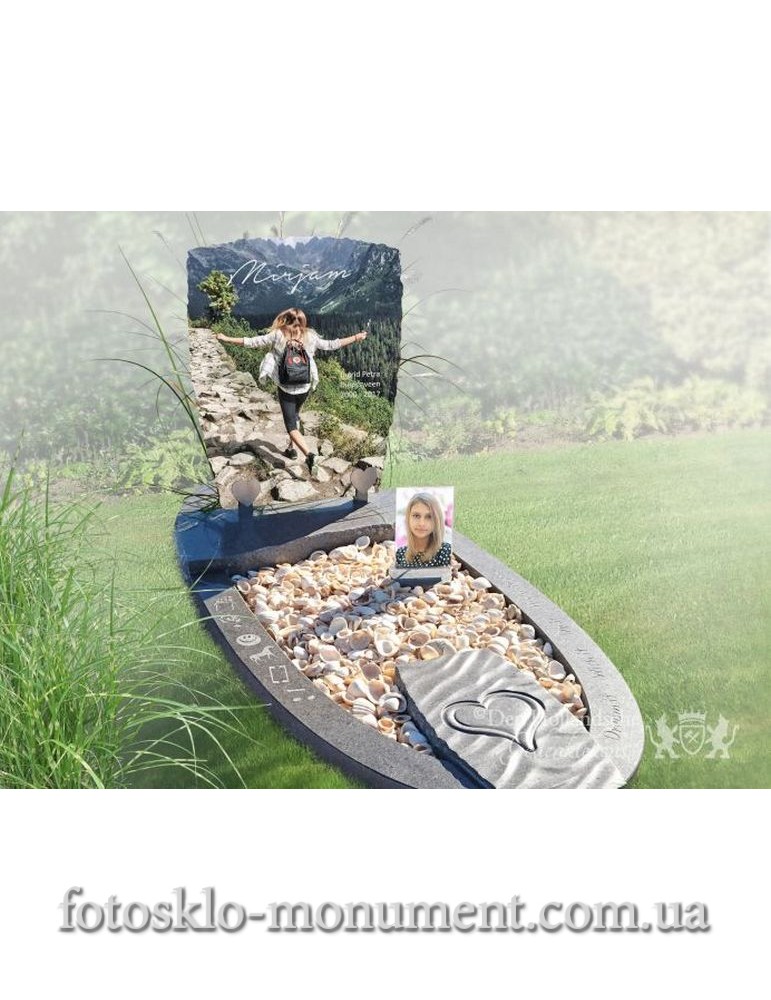 Чарівний ніжний пам'ятник зі скла, схожий на легкий човник з вітрилом. Дизайнерське рішення оформлене у вигляді сюжетного фото на пам'ятник неправильної геометричної форми, як ідея шляху людини, що упокоїлася, в чудовий світ, у світлу вічність. А початок цієї дороги лежить тут, на цій землі – у вигляді красиво оформленого насипу каміння у стилізованому квітнику. Така невелика унікальна пам'ятка з натурального каменю буде гарно виглядати як на звичайному цвинтарі, так і в колумбарії. Художнє різьблення, силует серця, м'які лінії-хвилі – всі ці елементи доповнюють та гармонійно співвідносяться з авторською ідеєю. На нижній частині надгробного пам'ятника розташоване ще одне фото у склі, яке повернуте обличчям до рідних та близьких, які прийшли вшанувати це особливе для себе місце, згадати прекрасні та світлі моменти з життя коханої людини.