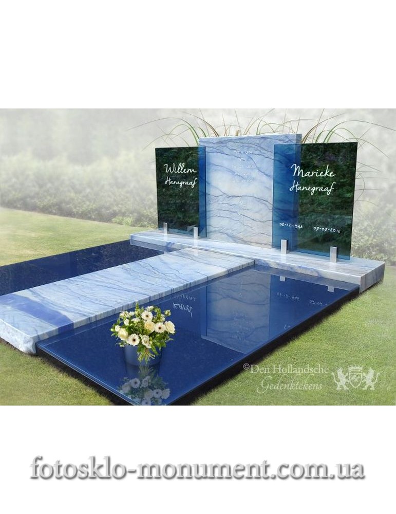 Гарний та гідний пам'ятник зі скла на замовлення можна зробити у вигляді сімейного меморіалу. Центральна основна частина кам'яного надгробка, виготовлена з блакитного мармуру з оригінальним природним малюнком, обрамлена за задумом дизайнера двома скляними прозорими стелами, затонованими в синій колір. Наземна частина могили з обох боків центральної плити оформлена фотосклом поверх гранітних плит. За вашим бажанням, на верхній частині пам'ятника з мармуру можна розмістити фото на склі, а також фотоколаж із сюжетних чи портретних знімків. Загальна ідея цього пам'ятника зі скла викликає в думках образ блакитної річки, яка в обрамленні темних дзеркальних берегів несе свої води зі світу земного у світ небесний, навіваючи сумні, але світлі спогади про рідних людей.